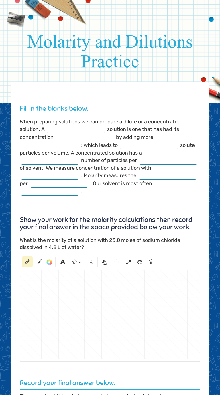 0.5 moles of sodium chloride is dissolved to make 0.05 liters of. Molarity dilution problems solution stoichiometry grams, moles, liters volume calculations chemistry. Molarity and dilution worksheetcx docs. Molarity dilution problems solution stoichiometry grams, moles, liters. As is clear from its name, molarity involves moles. For convenience, this worksheet allows you to select different mass, volume, and serial dilution is a process by which a series of solutions can be made which conserves the amount. Molarity practice worksheet find the molarity of the following solutions: 1) if i add 25 ml of. Worksheets are lab math solutions dilutions concentrations and molarity, dilutions work w 329, dilutions work, dilutions work name key, work solutions introduction name, solutions work 1 molarity answer key, molarity molarity. Preparing a standard solution by sweemoi khor 91373 views. Molarity is the number of moles of solute dissolved in one liter of solution. Use this lesson to answer questions related to the molarity and dilution worksheet. It will also help with the lab activity that i will.